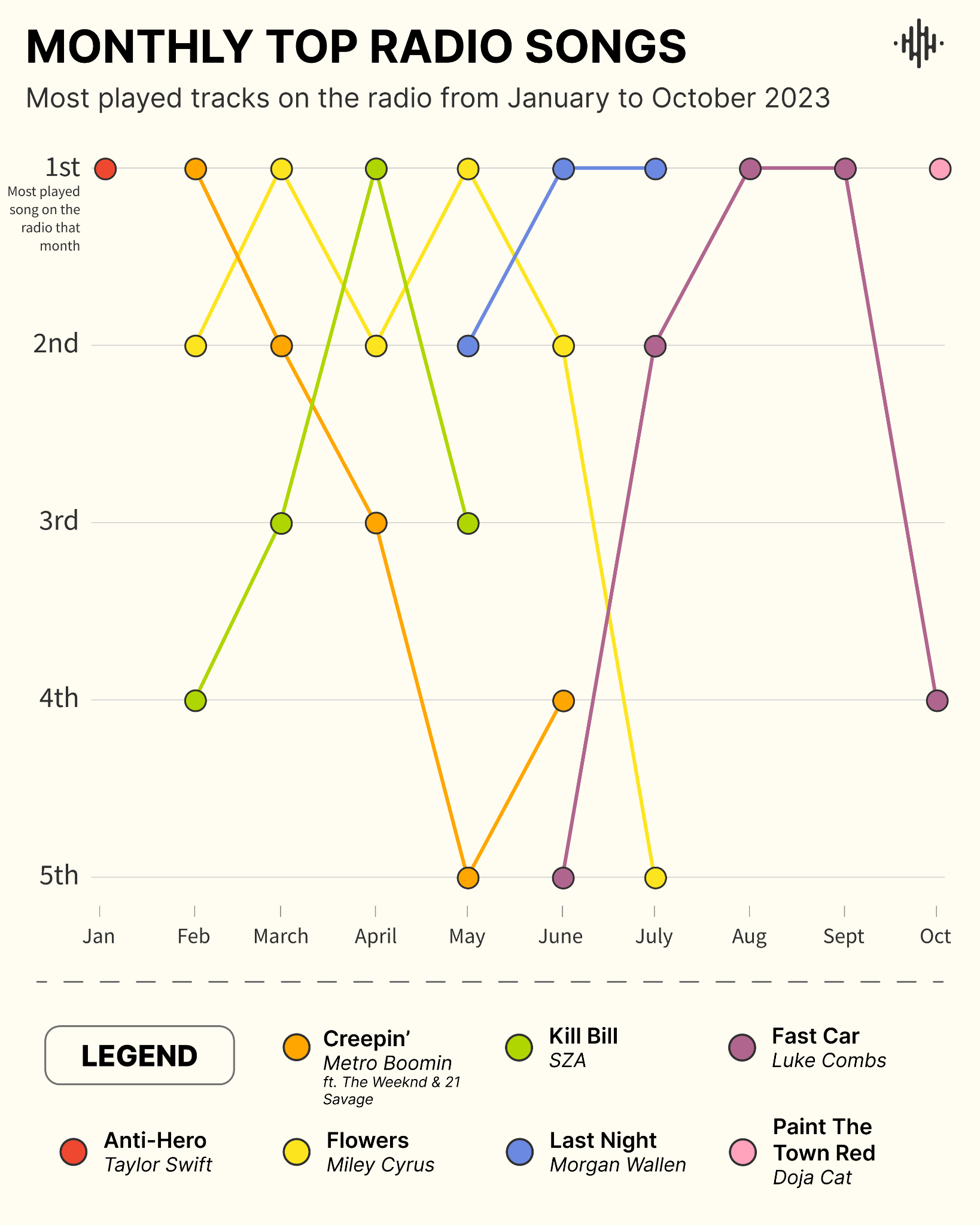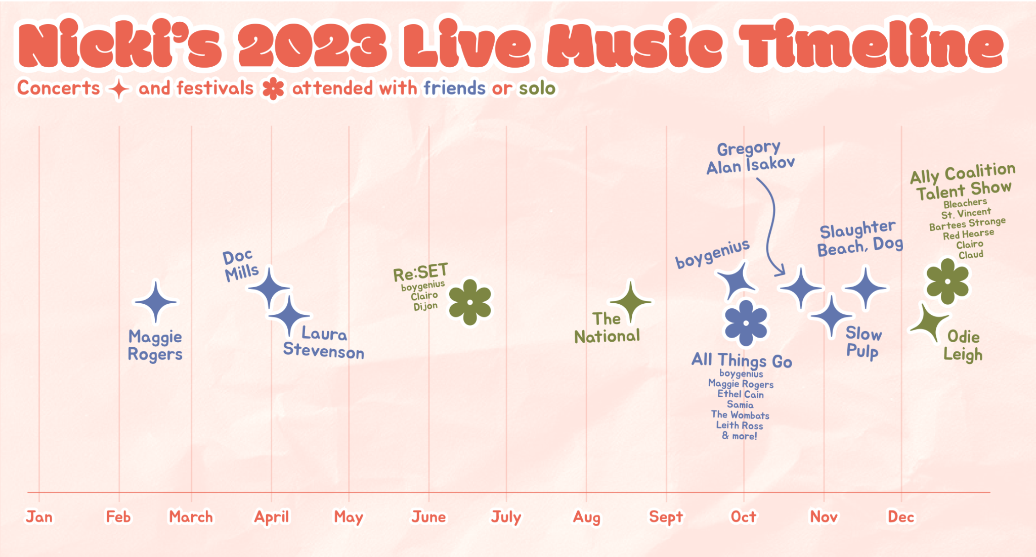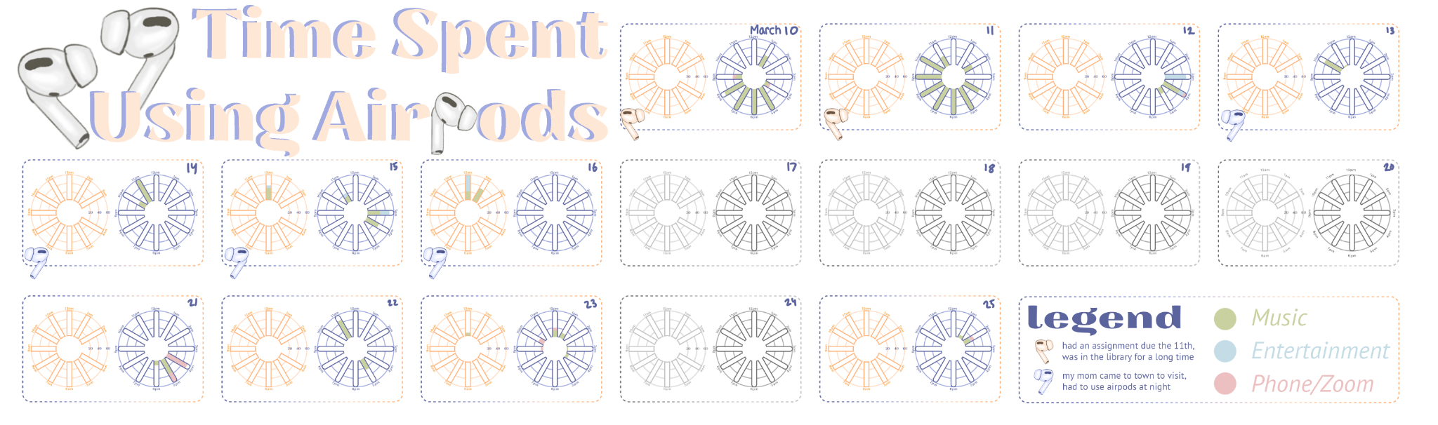 For my computational journalism class, we were tasked with collecting data on ourselves and them graphing it by hand without coding – this is one of the first times i've made a viz solely in Illustrator/Photoshop/Procreate and I'm really happy with how it turned out! Since I was tracking usage for each hour of the day, I wanted to do something circular and was looking at clocks, but wanted to keep the width continuous across the bars so went for more of a wheel design, with one for AM inspired by the sun and one for PM using more lunar shapes. There are three rings on each circle that correlate to 20 minutes, and every pair of circles represents one day. The grid overall is formatted like a calendar, with the weeks starting on Monday.